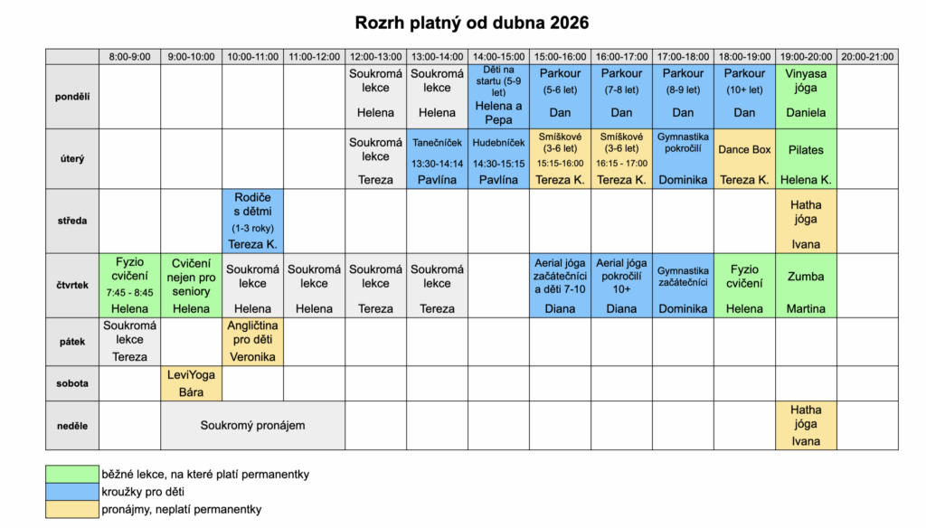 Lekce označené oranžovou barvou si organizují samotní lektoři, proto se prosím v případě dotazů a rezervací obracejte přímo na ně. Upozorňujeme také, že na tyto lekce nelze použít permanentky studia.